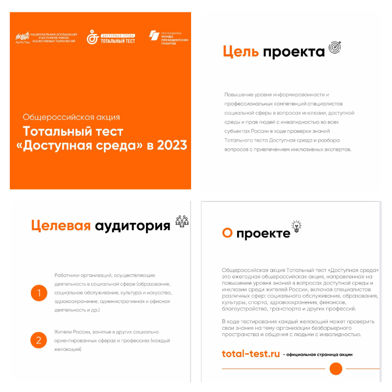 28.10.2023С 1 по 10 декабря 2023 года состоится общероссийская акцияТотальный тест «Доступная среда», приуроченная кМеждународному дню инвалидов. Акция направлена на привлечение внимания граждан к вопросам инклюзии и повышения качества жизни людей с инвалидностью, а также на повышение уровня знаний специалистов социально значимых сфер в вопросах взаимодействия, этики общения и создания доступной среды.